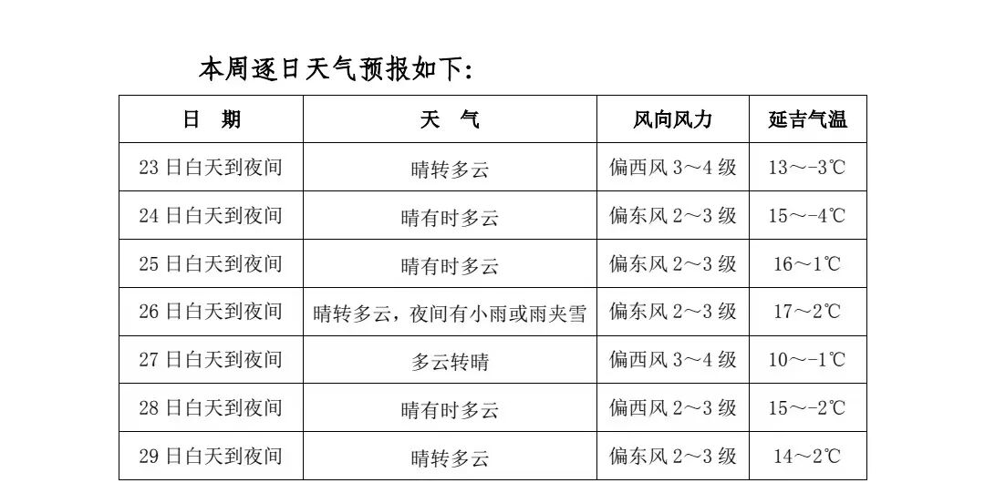 預(yù)計全州平均氣溫為6.0℃左右,比常年同期高4.5℃左右,24日-26日最高氣溫一般為14℃~18℃,27日氣溫下降,28日氣溫回升。全州平均降水量不足0.5毫米,比常年同期明顯偏少。預(yù)計26日夜間有小雨或雨夾雪。